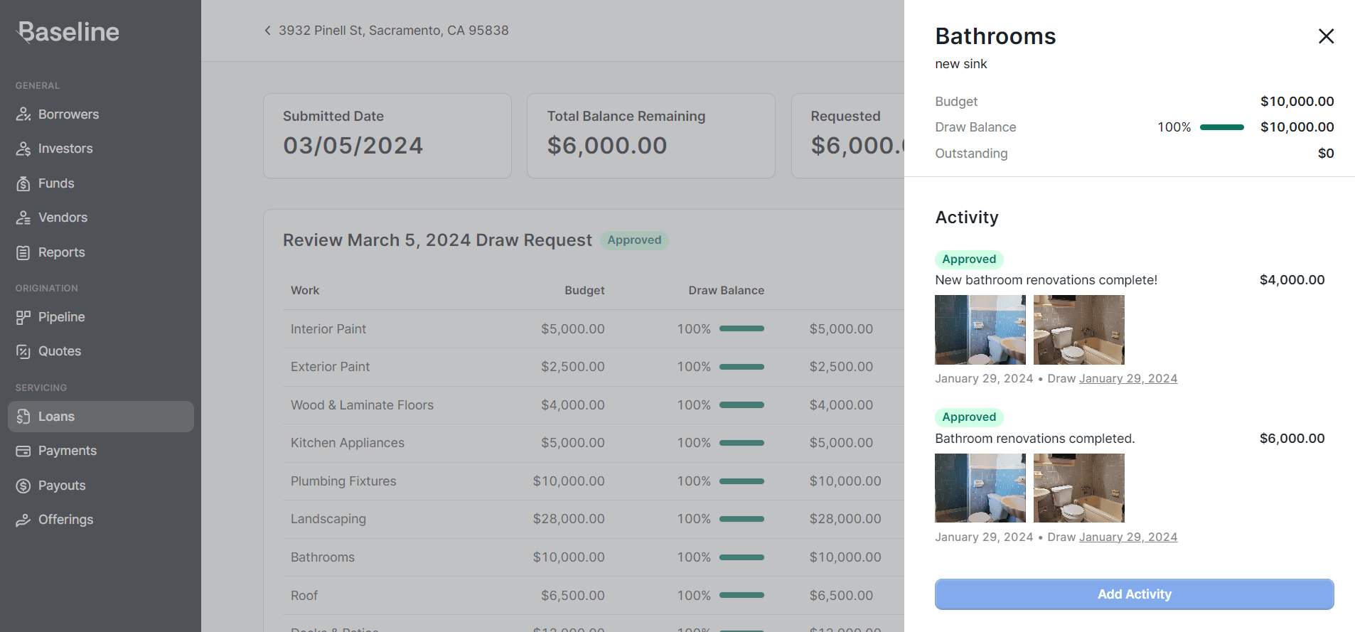 For lenders, a common source of inefficiency is getting a lump sum draw request and then trying to determine which items of the rehab budget have been completed. In Baseline, a single draw request comes in with amounts requested on each line item and pictures supporting that draw. This makes it much easier to systematically review the draw request and compare it back to the originally approved scope of work.
